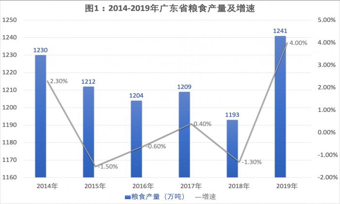 数据显示,2014-2019年间,广东省粮食产量实现总体增长,从2014年的1230万吨,增长至2019年的1241万吨(图1)。2019年,广东省粮食产量增速达4.00%,为6年间最高值,大幅逆转2015-2018年广东省粮食产量总体负增长趋势,保障粮食供应的基础稳固。