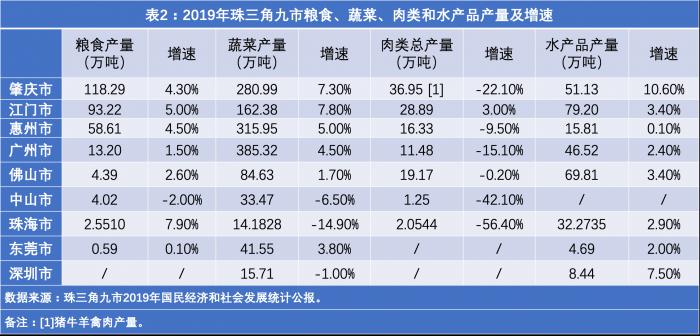 表2数据显示,2019年珠三角城市粮食总产量实现正增长(不含深圳市)。除中山市2019年粮食产量增速为-2.00%外,其余已公布相关数据的珠三角城市2019年粮食产量均为正增长,其中珠海市增速最高,达7.90%,大幅高于2019年广东省粮食产量平均增速。在已公布数据的珠三角城市之中,共4个城市2019年粮食产量增速高于全省平均水平,分别为珠海市(7.90%)、江门市(5.00%)、惠州市(4.50%)和肇庆市(4.30%)。