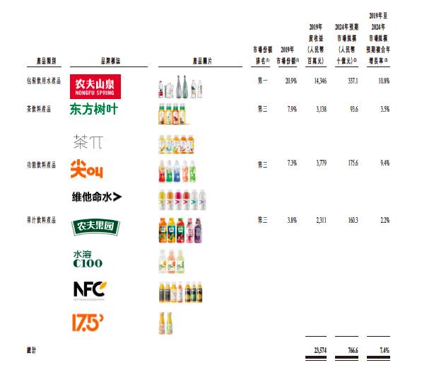 招股书显示,除了起家的“包装饮用水”,农夫山泉在茶饮料领域,推出了自2010 年至2019 年的十年中上市首12 个月零售额最高的中国饮料新品“茶π”;也推出了传统的中国茶“东方树叶”系列产品;功能饮料产品包括“尖叫”及“力量帝维他命水”;果汁产品覆盖了低浓度果汁“水溶C100”、中浓度果汁“农夫果园”及非浓缩还原的高品质纯果汁,包括“农夫山泉”NFC果汁系列及“17.5˚”果汁系列。