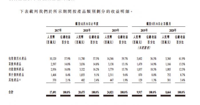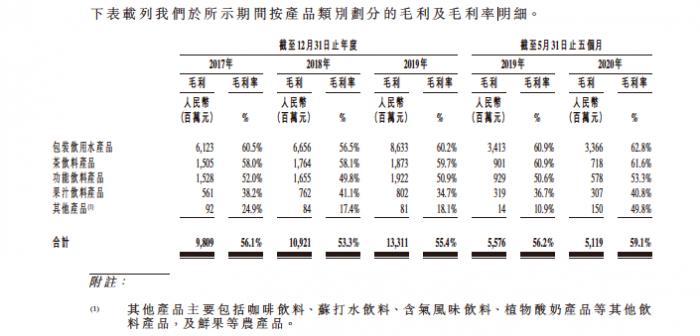 招股书显示,2017年、2018年及2019年以及截至2019年及2020年5月31日止五个月,茶饮料产品在总收益中的占比分别为14.8%、14.8%、13.1%、14.9% 及13.5%;同期,功能饮料产品在总收益中的占比分别为16.8%、16.2%、15.7%、18.5% 及12.5%;而果汁饮料产品在总收益中的占比分别为8.4%、9.1%、9.6%、8.8% 及8.7%。