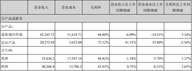 需要指出的是,亿联网络有很大一部分收入来自海外。以上半年为例,该公司营收总计12.01亿元,其中美洲、欧洲收入分别达5.56亿元和4.02亿元,合计占比近80%。