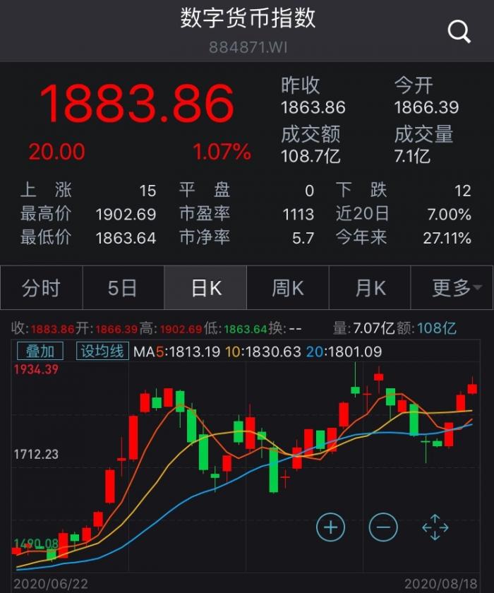 8月18日,数字货币板块高开低走,数字货币指数(884871)一度涨超2%,收盘微涨1.07%。赢时胜(300377.SZ)、御银股份(002177.SZ)涨停,格尔软件(603232.SH)、新开普(300248.SZ)、金冠股份(300510.SZ)、迪威迅(300167.SZ)、拉卡拉(300773.SZ)等多股涨超2%。今年以来,数字货币指数已上涨27.11%;近3个交易日涨幅超7%。