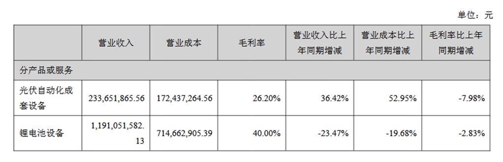 作为锂电装备龙头,先导智能锂电池设备上半年营收11.91亿元,同比下降23.47%,占总额的63.90%;毛利率40.0%,同比减少2.83个百分点。光伏自动化成套设备营收2.34亿元,同比增长36.42%;毛利率26.20%,同比减少7.98个百分点。