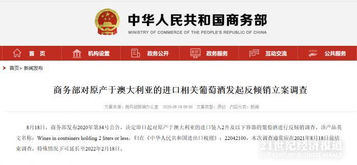 8月18日,商务部发布公告称,决定即日起对原产于澳大利亚的进口装入2升及以下容器的葡萄酒进行反倾销调查。