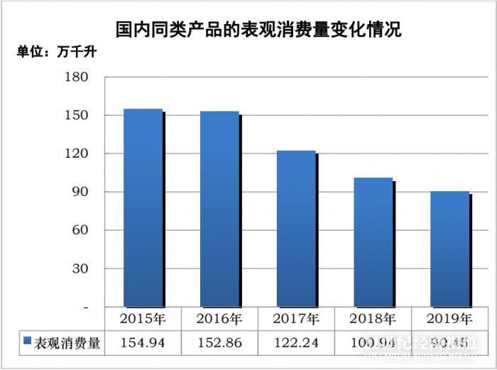 一方面,国内产业同类产品的产量由2015年的116.11万千升下降至2019年的45.15万千升,大幅减少61.11%。