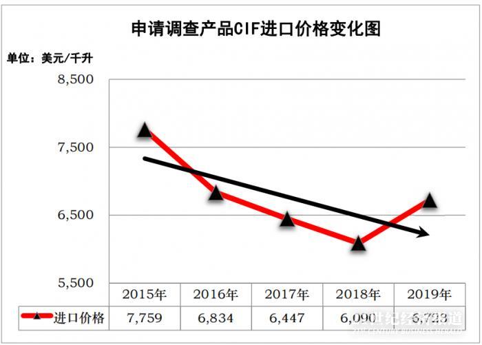 申请调查期内,澳大利亚该类葡萄酒的进口价格总体呈下降趋势。2015年至2019年,澳大利亚该类葡萄酒的进口价格分别为7,759美元/千升、6,834美元/千升、6,447美元/千升、6,090美元/千升和6,723美元/千升,2016年比2015年下降11.92%,2017年比2016年下降5.67%,2018年比2017年下降5.54%,2018年比2015年大幅下降21.51%,2019年比2018年上涨10.39%,但仍比2015年累计下降13.36%。