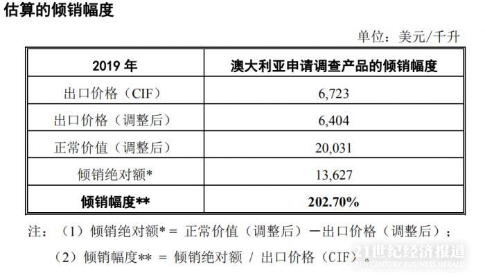 申请书认为,在进口数量持续大幅增长、市场份额持续上升、相对于国内同类产品总产量的比例也在持续上升的情况下,澳大利亚该类葡萄酒的降价行为对国内产业造成了巨大的冲击,申请书预估,澳大利亚该类葡萄酒的倾销幅度为202.70%。