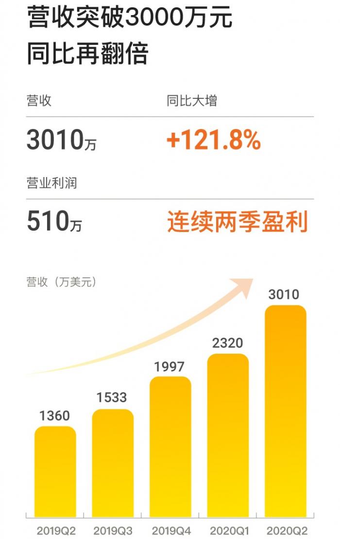 数据显示,2020年第二季度老虎证券营收3010万美元,连续两季度实现盈利。同比大增121.8%,营业利润达到510.7万美元,环比增长1.7倍。