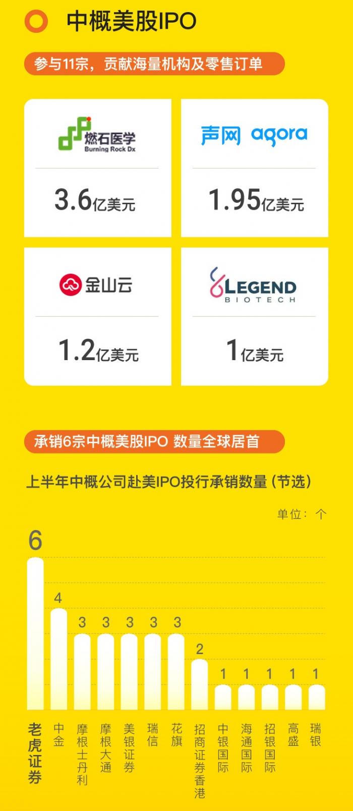 老虎证券在投行方面继续领跑中资券商,共参与7宗中概美股IPO承销和分销,包括金山云、达达、声网、燃石医学、传奇生物、优克联、亿邦国际。