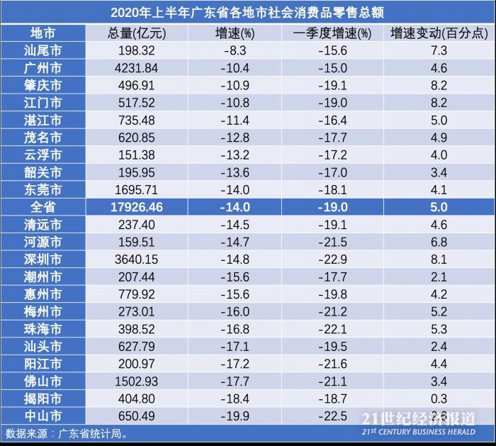 与上半年广东省社会消费品零售总额增速(-14%)相比,上半年广东省21个地市中共有9个地市社会消费品零售总额增速高于或等于全省平均水平,其中珠三角城市广州、肇庆、江门和东莞四市入榜。