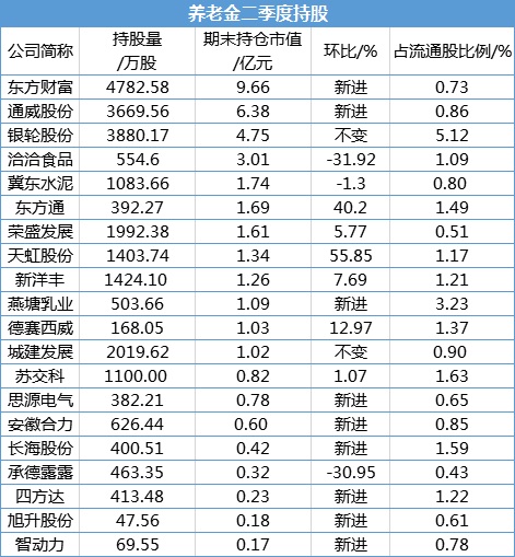 6、养老金最新持仓股:二季度养老金新进9股,增持6股,减持3股,2股持仓不变。上述养老金重仓的20家公司合计持股市值约38.12亿元,其中东方财富、通威股份、银轮股份和洽洽食品获重仓超3亿元。