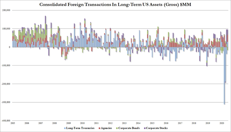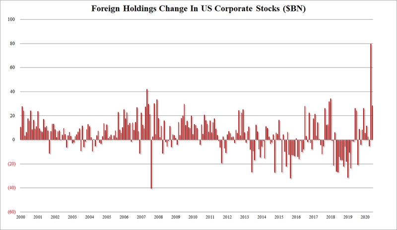 与此同时,海外投资者在6月份购买了285.22亿美元的美国股票,5月份时购买量达到创纪录的797亿美元。