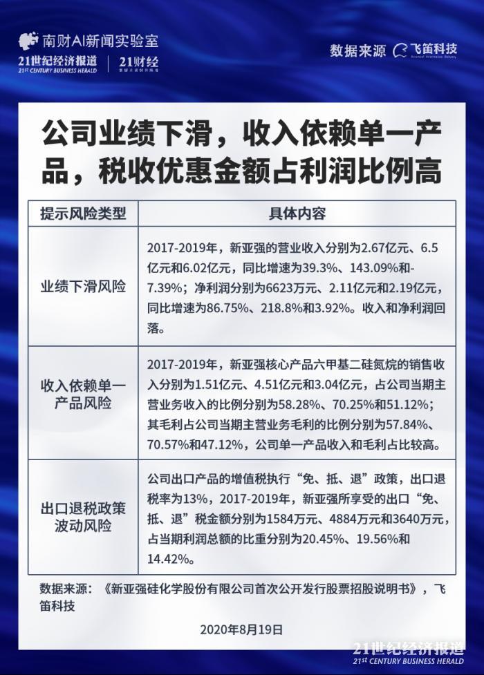 南财AI新闻实验室整理发现,排除一些常规性风险,发现有三大风险与公司的经营关联性高,分别是业绩下滑风险,收入依赖单一产品风险,以及出口退税政策波动给业绩带来的风险。