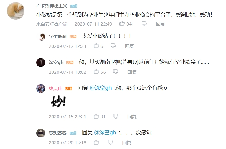 有用户在视频下放留言,“小破站是第一个想到为毕业生举办毕业晚会的平台了,感谢 B 站,感动!”有网友不合时宜的说道:其实芒果卫视从前年就有毕业歌会了.......然后,他就收到了成队形的回复“没感觉”。