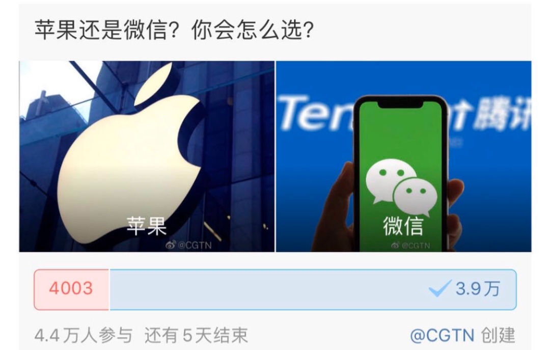 而整个中文互联网,用户粘度有如此之大的另一个产品就是微信。不久前,美国总统特朗普宣布要封杀在苹果手机上微信。有博主在微博上发起二选一的投票,4.4万人参与,3.9万人选择微信。