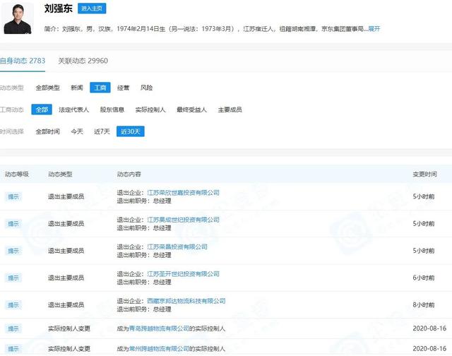 除了异常低调,刘强东还频频从京东系商业帝国卸任重要职务。根据企查查不完全统计,仅仅2020年,他就卸任了200来家京东系职务的法定代表人、董事长或其他高级管理人员。