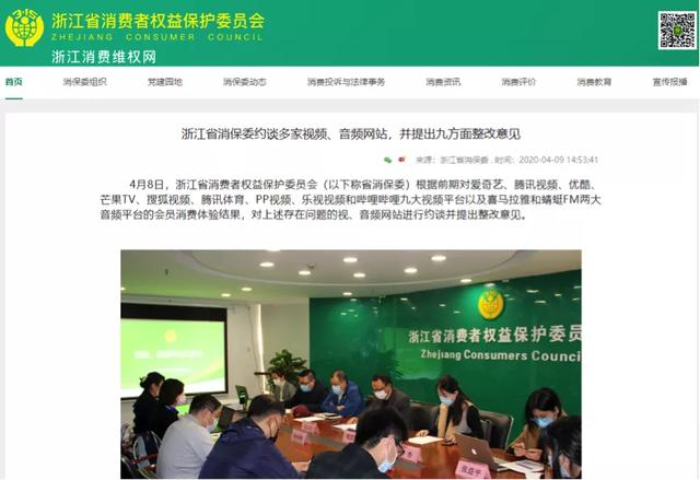 今年4月8日,据浙江省消费者权益保护委员会(以下称浙江省消保委)官网消息,浙江省消保委根据前期对爱奇艺、腾讯视频、优酷、芒果TV等九大视频平台以及喜马拉雅和蜻蜓FM两大音频平台进行约谈,并提出九方面整改意见。