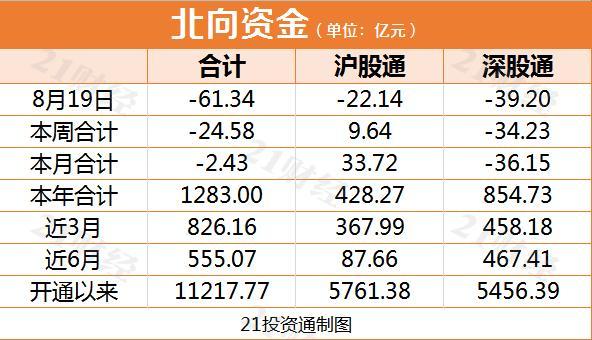 北向资金净卖出61.34亿元,其中沪股通净卖出22.14亿元,深股通净卖出39.2亿元。这是北向资金连续第二天净流出,两个交易日合计净流出81.72亿元。