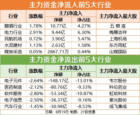 8月19日,电力股逆市上涨。主力资金净流入电力行业9.44亿元,仅次于酿酒行业。板块内50只个股实现主力资金净流入,占比72.5%。其中,24只股主力资金净流入超千万元,梅雁吉祥1.51亿元居首位。为何逆市上涨,能否将复制2015年行情?21投资通分析>>>
