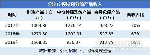 从公司销售药品业务的治疗领域来看,公司产品主要为肿瘤产品、中枢神经系统产品,以及自身免疫产品。2017年至2019年,这三项产品产生的收入占销售药品业务收入的比重分别为71%、70%和69%,占公司营业收入的比重分别为70%、67%和66%。