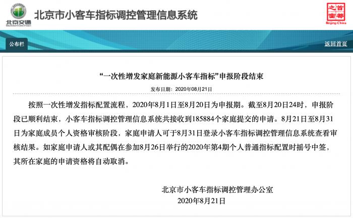 8月21日,北京市小客车指标调控管理办公室发布消息称,“一次性增发家庭新能源小客车指标”申报阶段结束,截至8月20日24时,小客车指标调控管理信息系统共接收到185884个家庭提交的申请。