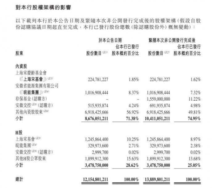 本次非公开发行完成后,徽商银行股权架构将会发生变化。其中,存保基金88.9亿入股徽商银行,将持股11.22%。