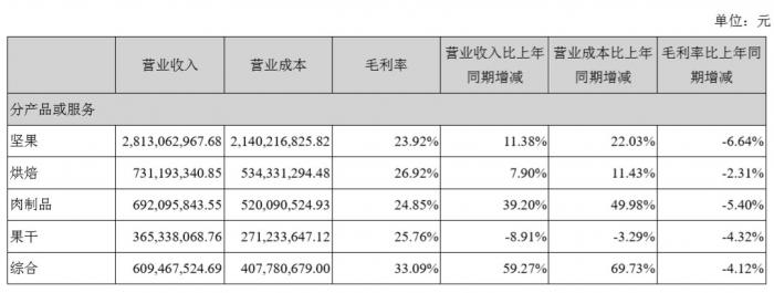 具体分产品来看,除果干以外,其余品类营业收入相比往年均有提高。其中肉制品收入6.92亿元,比上年同期增长39.2%;果干收入3.65亿元,比上年同期下滑8.91%。坚果、烘焙、肉制品、果干的毛利率均有所下滑。上半年,三只松鼠综合毛利率为33.09%,同比下滑4.12%。