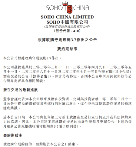 根据8月13日SOHO中国发布的终止私有化事项公告,因未达成共识,宣布终止早前要约私有化事项。截止到公告日期,公司与任何第三方并未就潜在交易订立任何正式或具法律约束力的协议。
