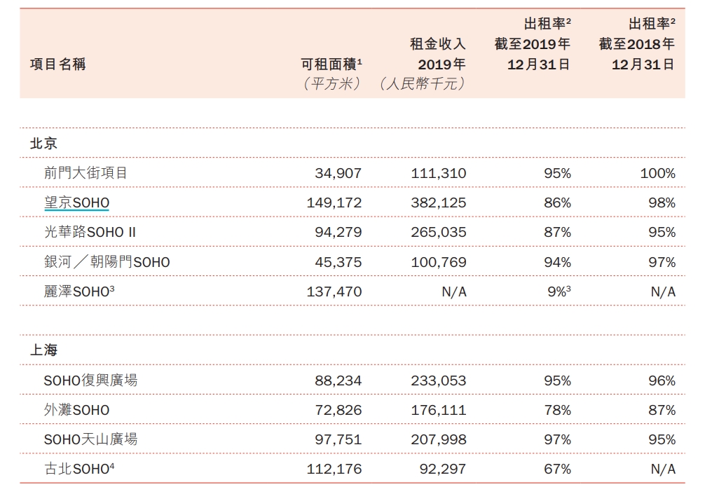 根据2019年年报,SOHO中国的投资物业(SOHO系列)共九个,分别是位于北京的前门大街项目、望京SOHO、光华路SOHO、银河/朝阳门SOHO、丽泽SOHO,以及位于上海的SOHO复兴广场、外滩SOHO、SOHO天山广场、古北SOHO,2019年租金收入合计15.69亿元。这与2012年潘石屹扬言“5年后,租金年收入将超过40亿元”的目标相差甚远。