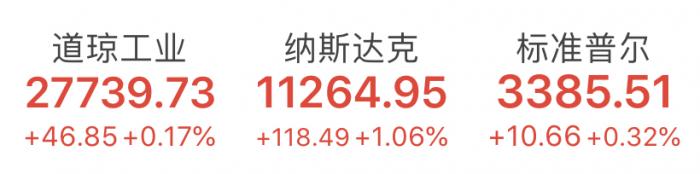 美国东部时间8月20日,市场正在消化经济数据与美联储会议纪要,三大股指集体收涨,其中纳指一度最高涨至11283.62点,再创盘中历史新高。截至收盘,道琼斯工业平均指数涨0.17%,报27739.73点;纳斯达克综合指数涨1.06%,报11264.95点;标普500指数涨0.32%,报3385.51点。