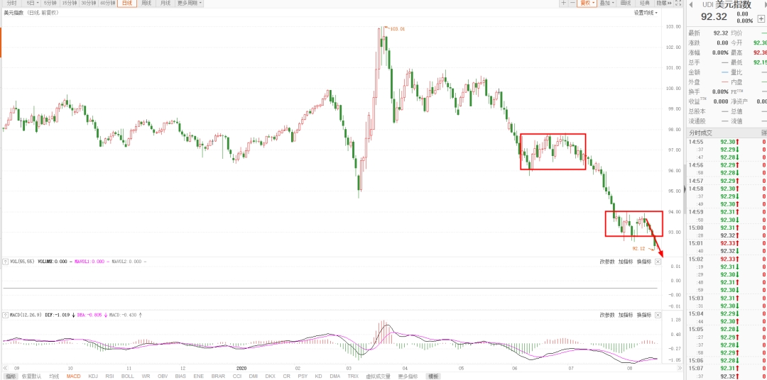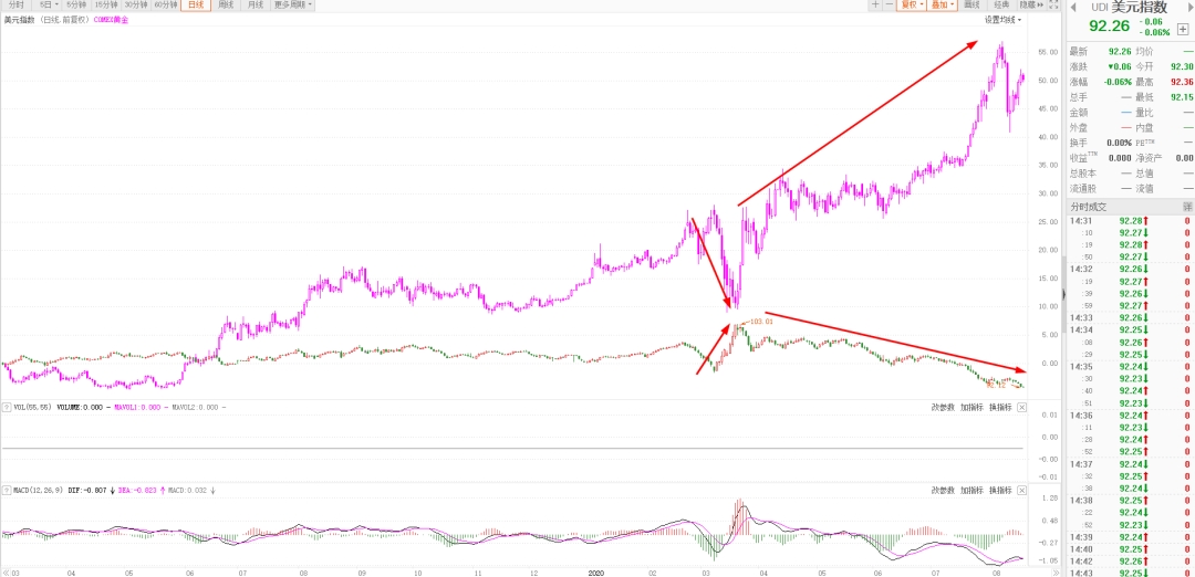因为黄金是美元的计价单位,黄金涨则美元跌,黄金跌则美元涨。今年三月份之后,这一现象表现的非常明显。所以,我们可以研究下美元指数来辅助判断黄金未来一段时间的趋势。