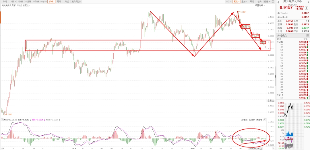 除了从美元指数角度看,这波下跌到了尾声外,人民币对美元汇率走势也可以看出这一点。