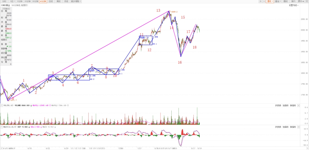 现在的关键来了,如果这笔反弹不能创13号点的高点,在现在位置或14-15的区间结束的话,那日线级别就做出了二卖,黄金的周线调整就要开启了。