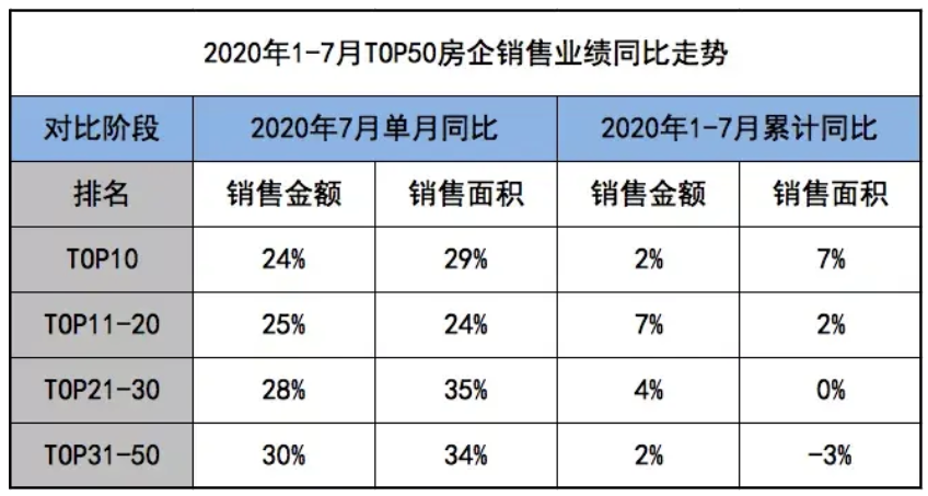 从累计销售业绩来看,1至7月百强房企整体业绩同比增长2.7%。