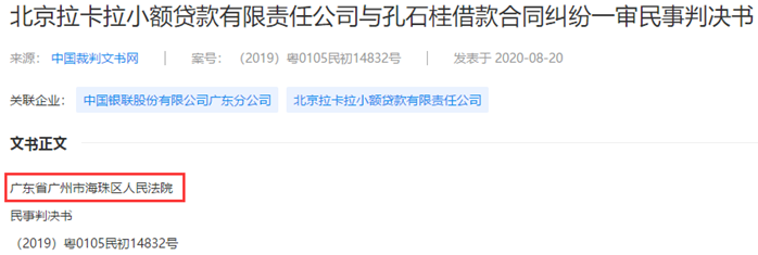 1)《北京拉卡拉小额贷款有限责任公司与孔石桂借款合同纠纷一审民事判决书》显示: