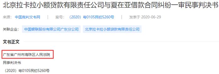 查询涉及两家小贷公司的裁判文书发现,多为2016年、2017年的贷款合同,由于借款人逾期不还款,两家小贷公司将借款人告上法庭,并主张按照年化24%的利息偿还借款本息。其中,拉卡拉广州网络小贷主要通过广州互联网法院和广东省广州市越秀区人民法院起诉借款人,而拉卡拉北京小贷公司却主要通过广东省广州市海珠区人民法院起诉借款人。
