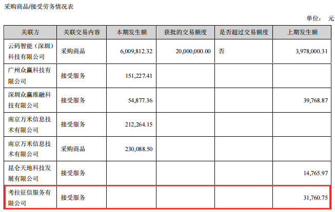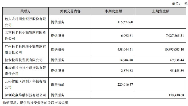 新经济IPO注意到,拉卡拉半年报显示,关联企业“考拉征信服务有限公司”本期未与拉卡拉发生关联交易,上期发生额为3.18万元。