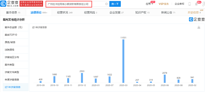 新经济IPO注意到,虽然拉卡拉与北京拉卡拉小贷(小贷公司)、广州拉卡拉小贷(网络小贷)发生的关联交易金额大幅减少,但两家小贷公司在今年的涉案信息却出现暴增,尤其3月份两家公司的涉案信息分别高达16183件和11031件。