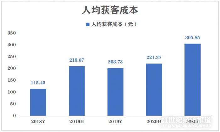 费用的增长,一方面使得新东方在线的人均获客成本大增,在2020财年,新东方在线的人均获客成本为305.9元,较2019财年的203.73元同比增长了50.1%。