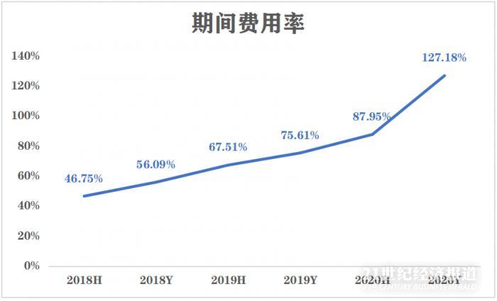三项费用的增加,直接导致新东方在线2020财年的期间费用飙升至13.74亿元,较2019财年增加了6.8亿元,同比增长97.8%,而2020财年的总营收也才10.8亿元,期间费用率也持续上升,达到127.18%。