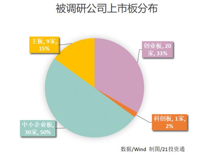统计显示,被机构调研的这60家公司中,属于中小板的有30家,属于创业板的有20家,科创板企业1家,中小创占比持续保持高位,另外9家来自主板。
