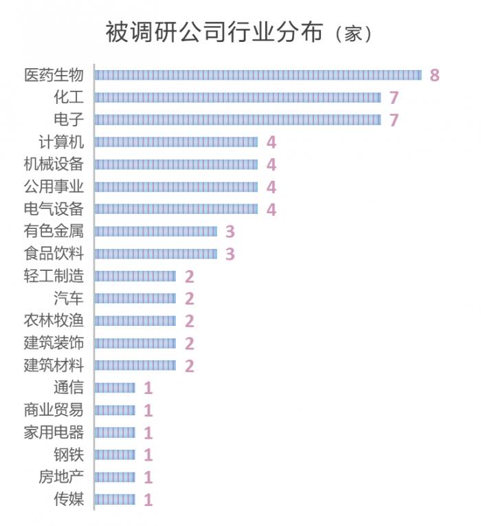 从行业分布来看,医药生物行业最受机构青睐,普洛药业(000739.SZ)、圣达生物(603079.SH)一心堂(002727.SZ)、鹭燕医药(002788.SZ)等8家相关公司被调研,其次是化工、电子行业,均有7家公司获调研。