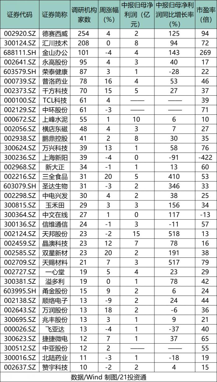 具体到公司而言,过去一周有3家上市公司获得百家以上家机构扎堆调研。其中德赛西威(002920.SZ)成为最受机构青睐的个股,参与机构多达254家,包括淡水泉、敦和、煜德投资等多家百亿私募。