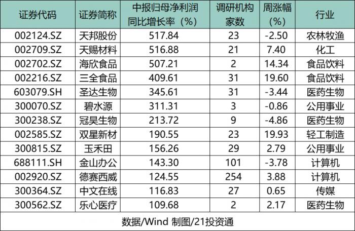 整体来看,被机构调研的60家公司中,有56家公布了2020年中报,其中13家净利润同比翻倍。天邦股份(002124.SZ)扭亏,同比涨518%;天赐材料(002709.SZ)和海欣食品(002702.SZ)大幅增长500%以上。