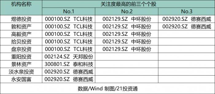 从具体调研机构来看,除了德赛西威,TCL科技(000100.SZ)、中环股份(002129.SZ)、天邦股份(002124.SZ)、泰和科技(300801.SZ)等企业也获百亿私募调研,参与机构包括重阳投资、高毅资产、淡水泉投资等。