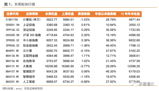 上周,计算机板块下跌了1.03%,同期创业板指下跌了1.36%,沪深300上涨了0.30%,板块跑输大盘。