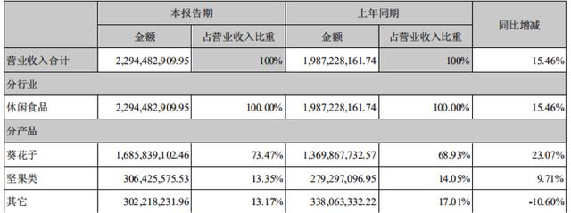 葵花子类产品实现收入16.86亿元,同比增长23.07%,占总营收比重73.47%,实现了33.09%的毛利率;