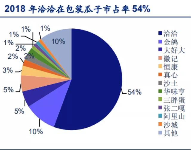根据尼尔森数据,2018年洽洽在包装瓜子的市占率达到54%,推算包装瓜子规模(零售口径)约78亿元,远超第二名金鸽瓜子、大好大瓜子10%的市占率。