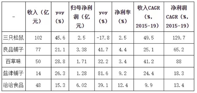 主要休闲食品公司2019年收入、归母净利润以及2015-19年CAGR: