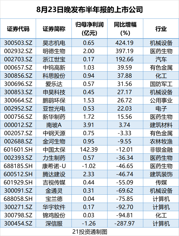 公告精选丨昊志机电:上半年净利6535万元,同比增424%